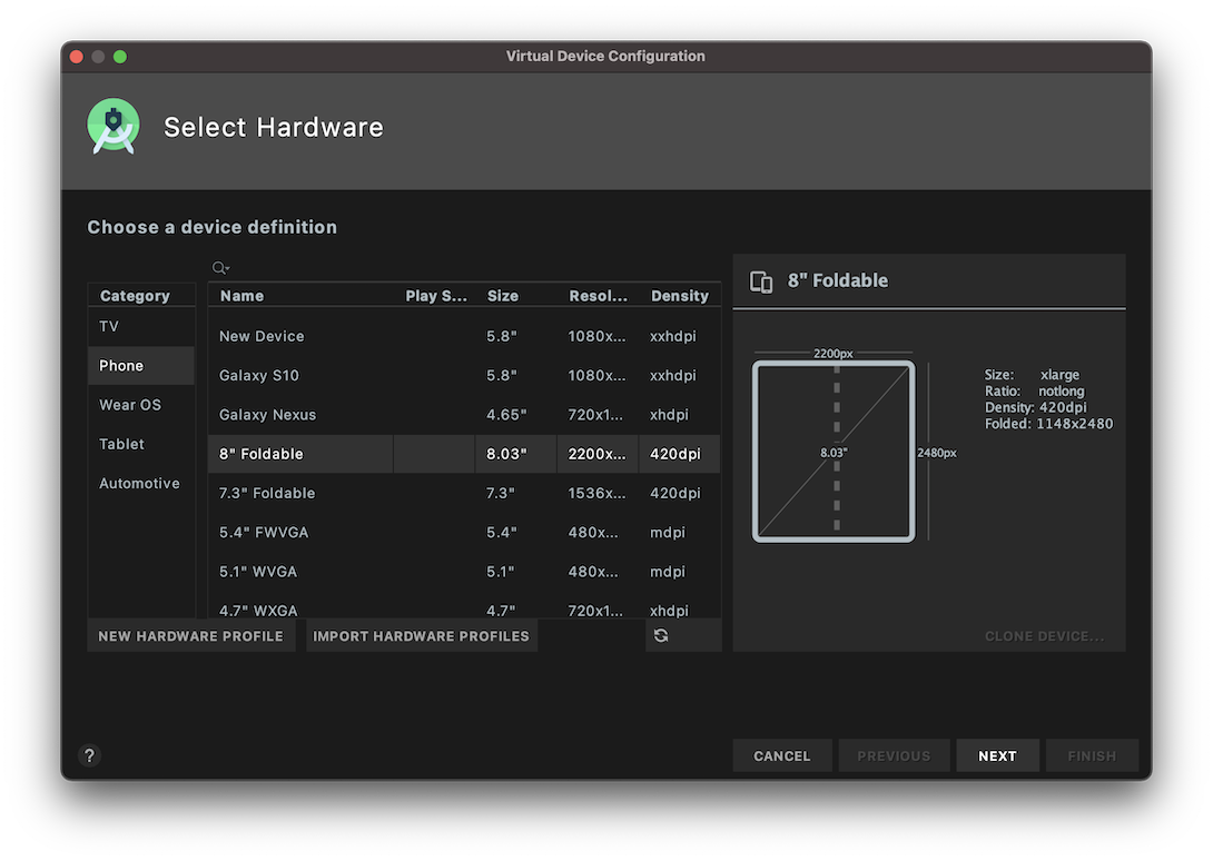 AVD를 만들 때 기기 선택하는 화면에서 Foldable 기기를 선택할 수 있습니다.