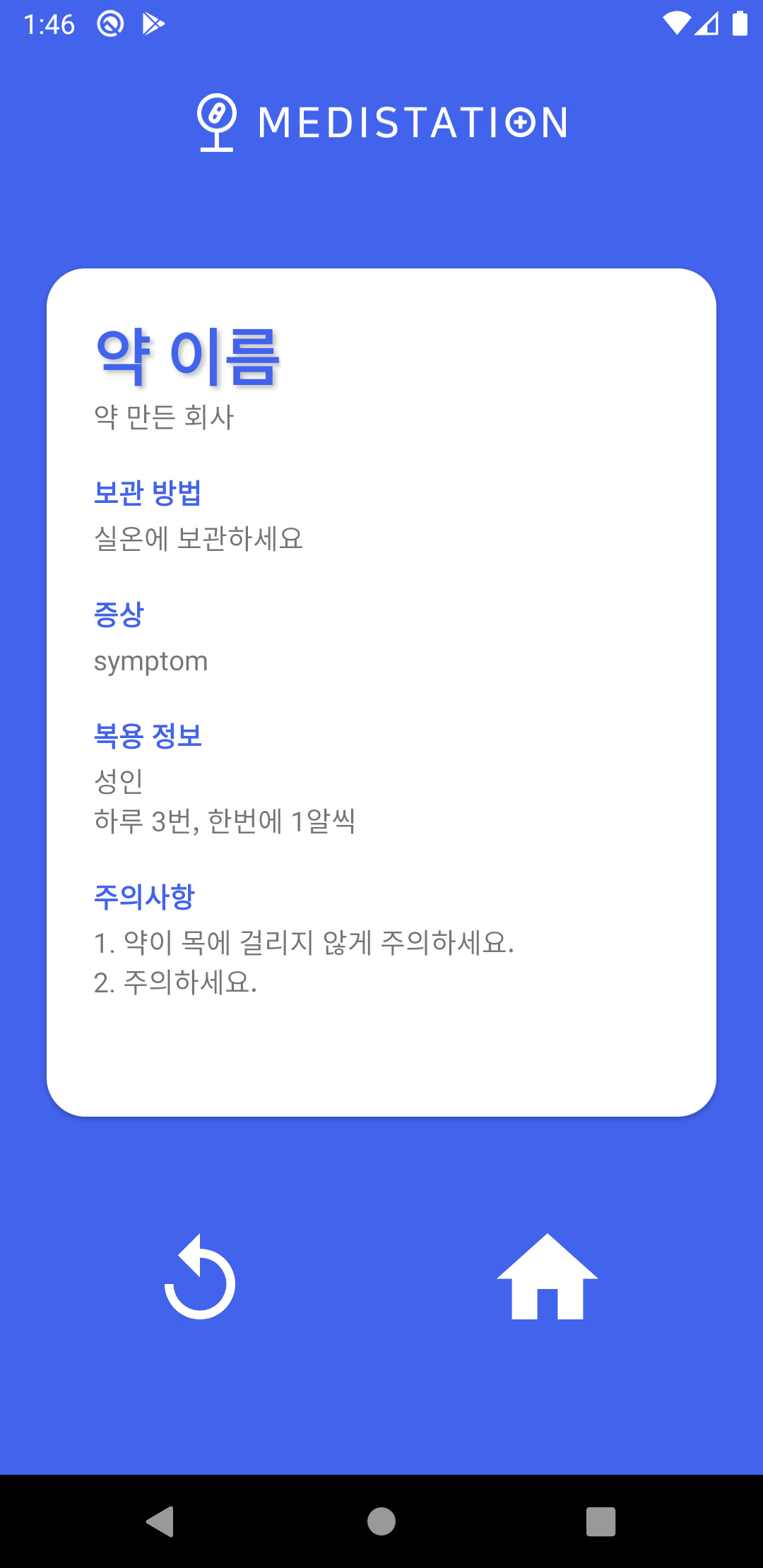 사용자가 Medistation 기기에 약을 스캔하면 그 사용자의 의학 정보에 따라 복용 가능한 약인지 아닌지를 판단해 의학적 사고를 줄이기 위한 서비스이다.