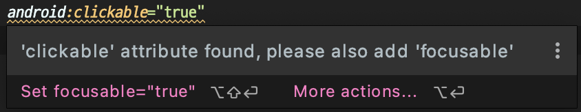 저는 지금까지 clickable만 쓰면 항상 이 경고가 떠서 focusable도 같이 써줬는데, 이제는 그럴 필요가 없습니다 🎉🎉