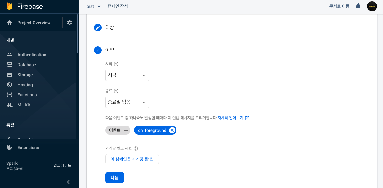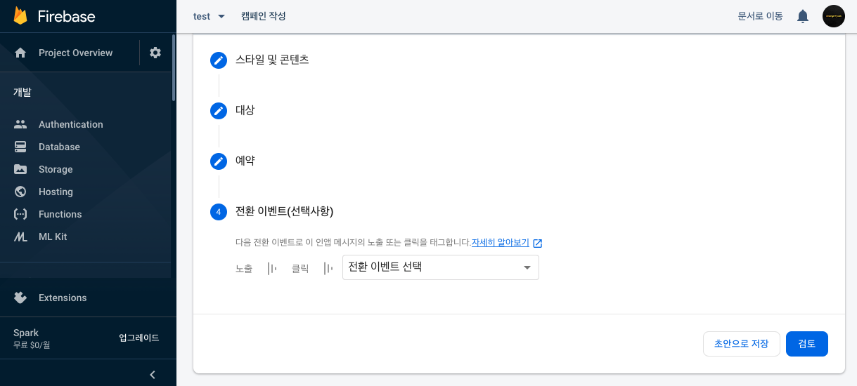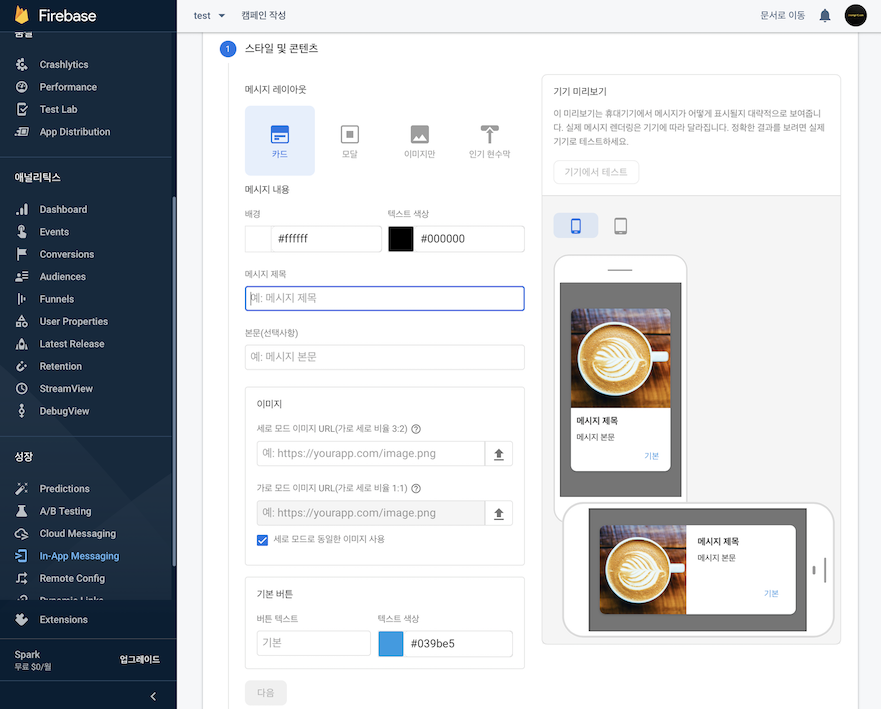 Firebase 콘솔에서 In-App Messaging 탭에 들어갑니다.