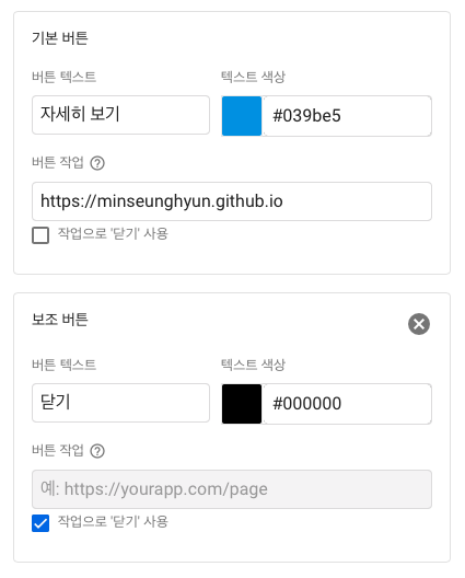 - 기기당 빈도 제한 : 메시지가 보여질 빈도를 설정합니다. 기기당 한 번 또는 n일에 한번 이하로 표시되게 할 수 있습니다.