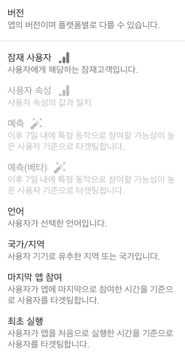 (비활성화되어있는 사용자 속성은 콘솔에서 새로운 사용자 속성을 추가하면 선택할 수 있고, 예측은 콘솔에서 예측을 활성화하면 선택할 수 있습니다.)